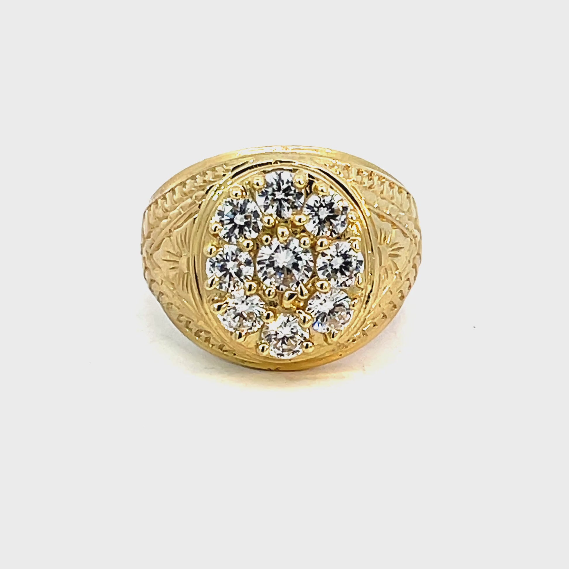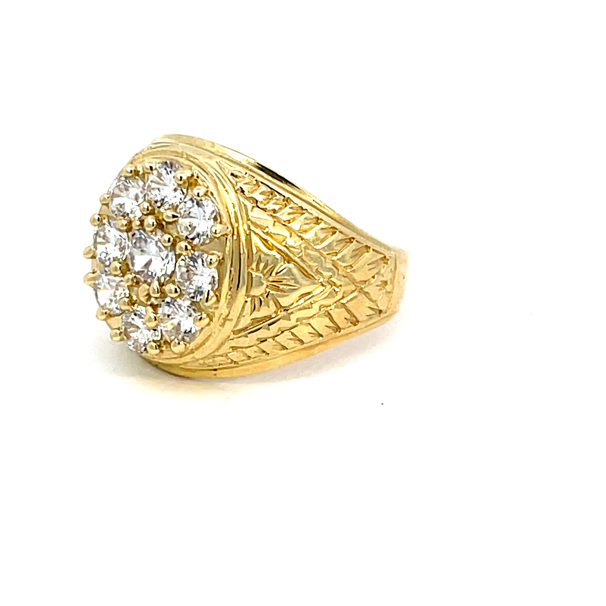 This stunning gold ring features a beautiful cluster of sparkling zirconia, arranged in a captivating floral design. The intricate engravings on the band add a touch of sophistication, making it a perfect accessory for any occasion.