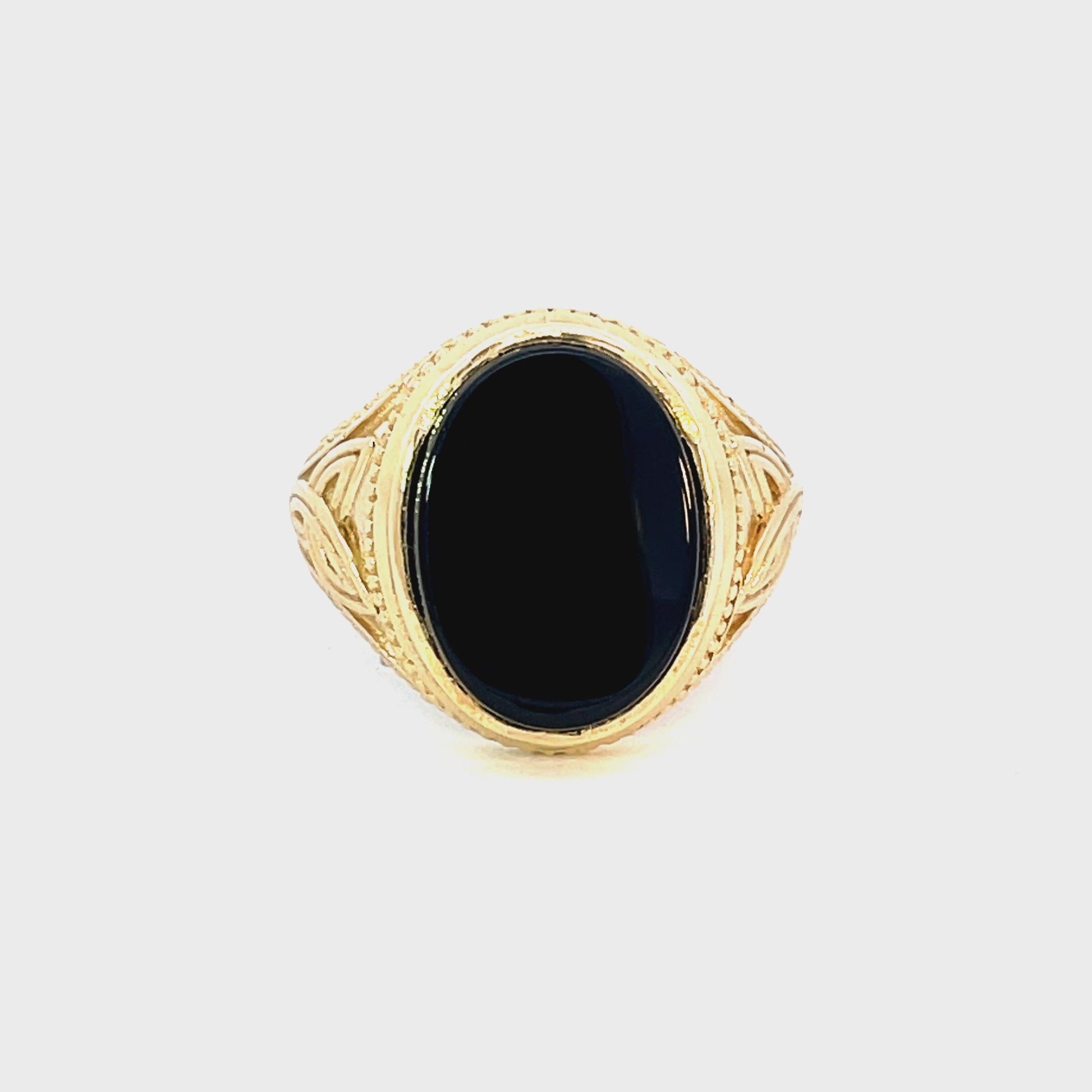 This exquisite gold ring features a striking black Onyx at its center, exuding sophistication and timeless elegance. The intricate detailing on the band adds a touch of luxury, making it perfect for any special occasion or as an everyday statement piece.