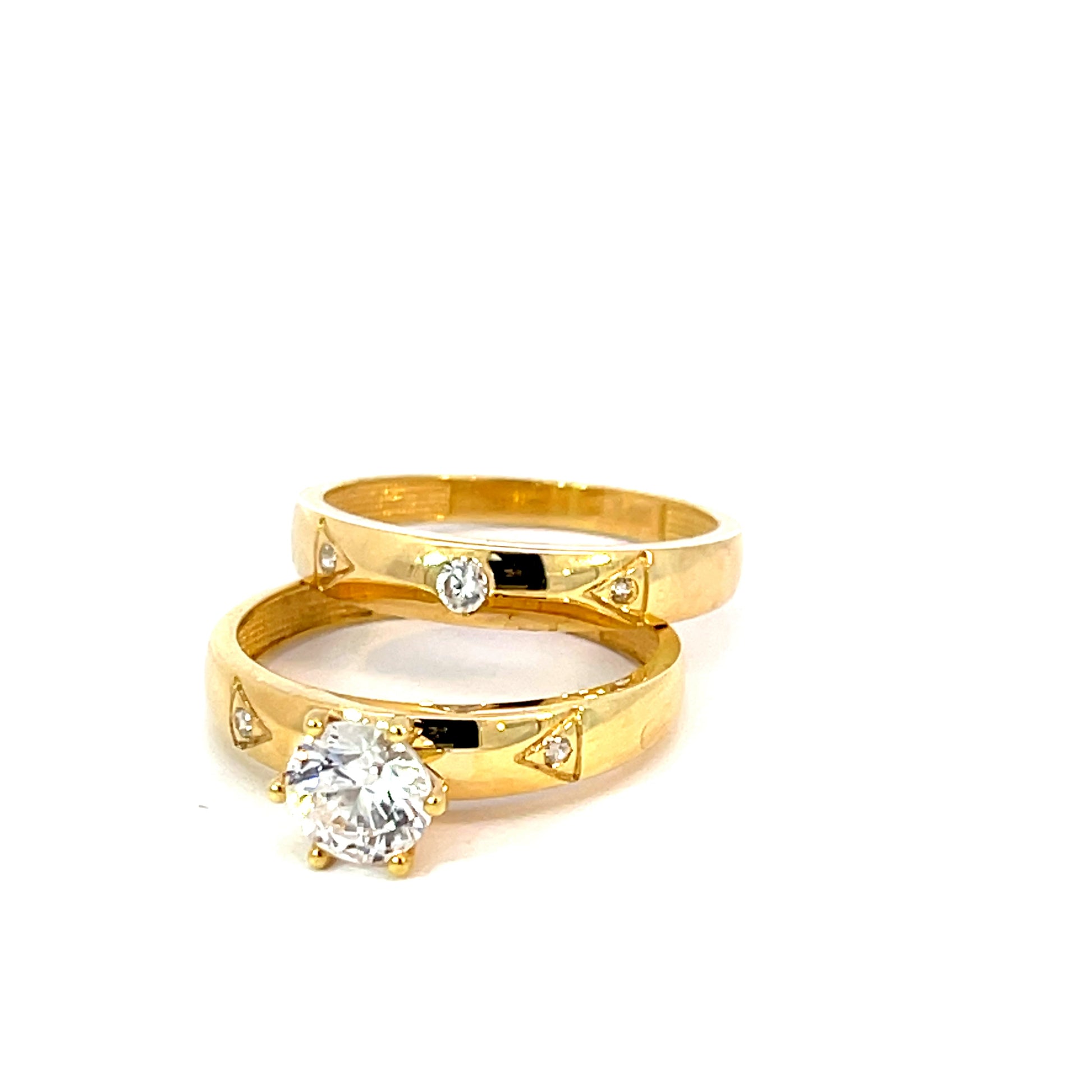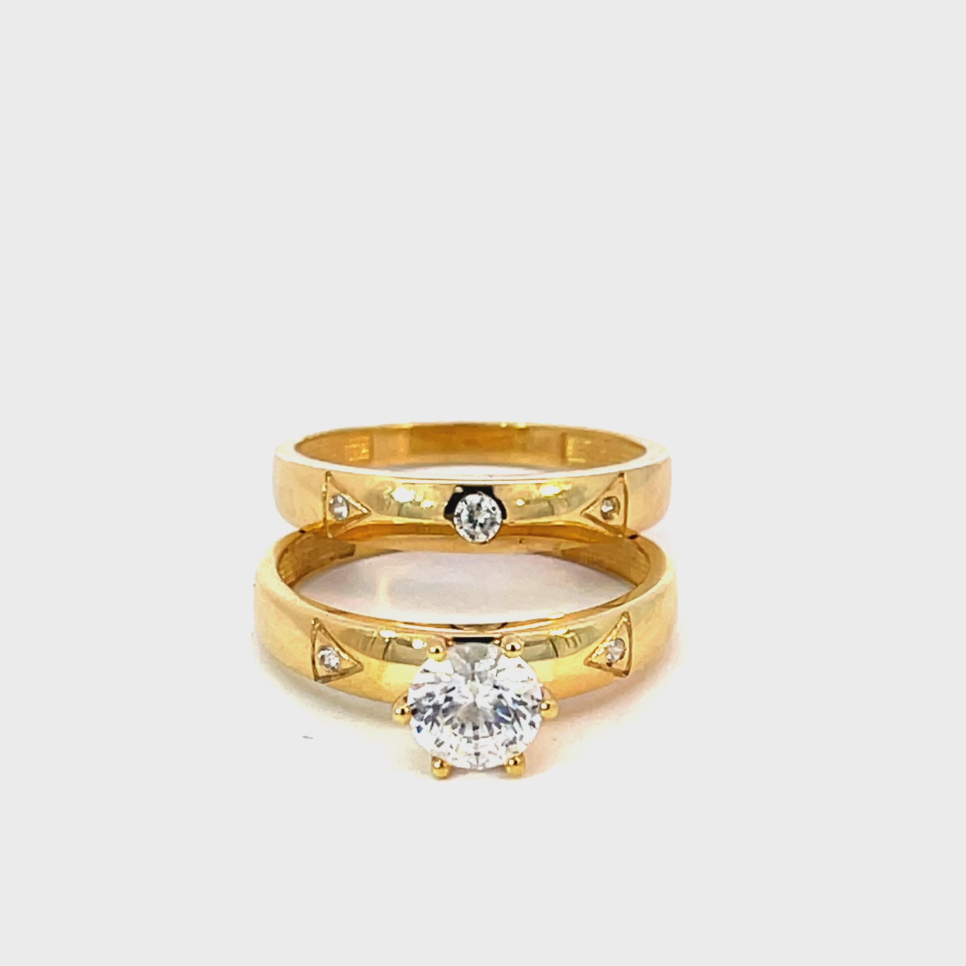 This stunning set of gold rings features exquisite craftsmanship and timeless elegance. The larger ring boasts a brilliant round-cut diamond, while the accompanying band is adorned with smaller zirconia, creating a harmonious and luxurious look.