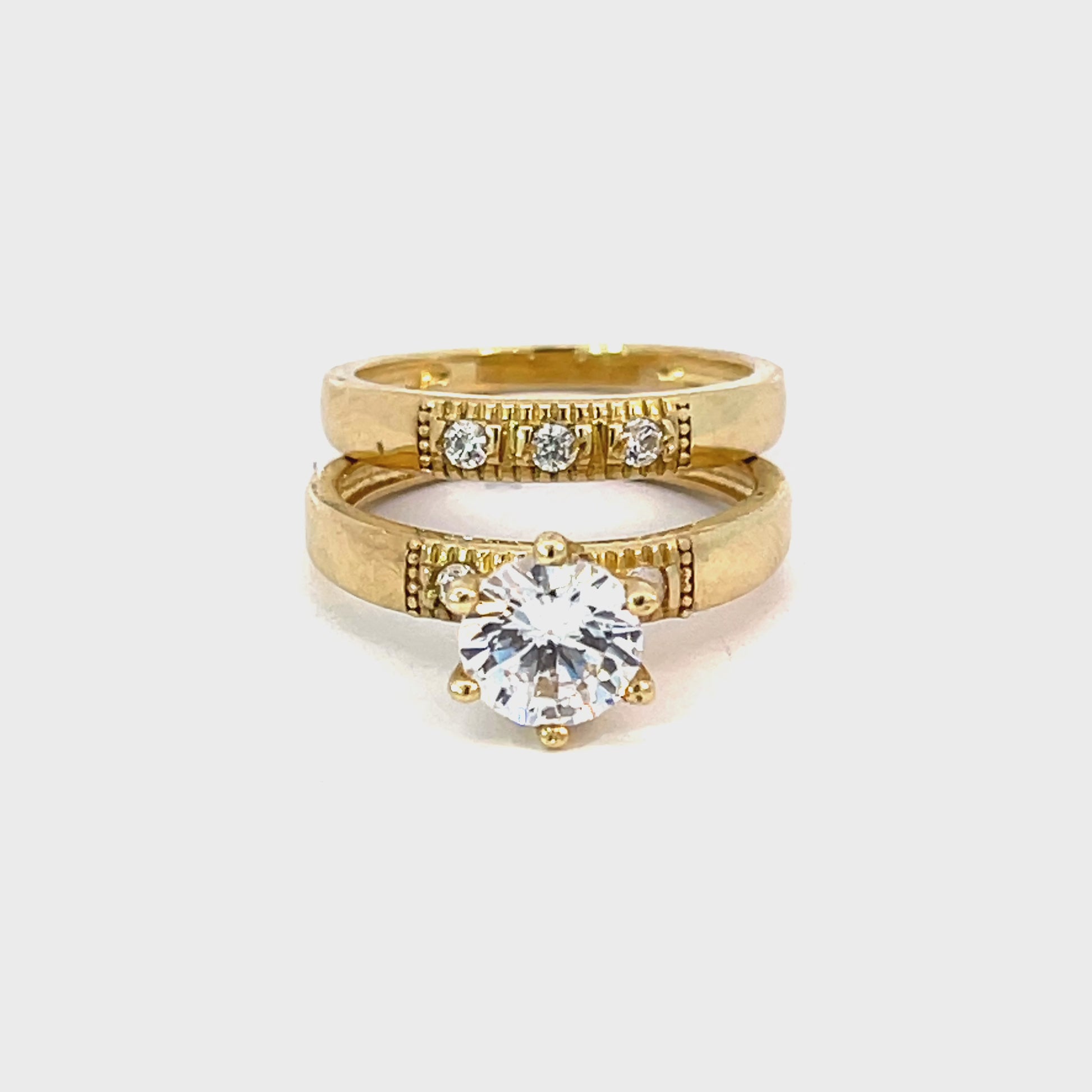 This stunning set of gold rings features exquisite craftsmanship and timeless elegance. The larger ring boasts a brilliant round-cut diamond, while the accompanying band is adorned with three smaller diamonds, adding a touch of sophistication to any outfit.